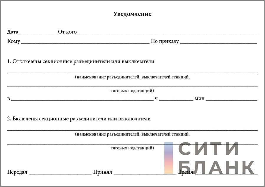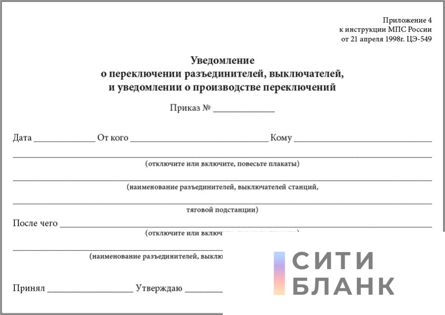Уведомление о производстве переключений (Приложение 4 к Инструкции дежурному района электроснабжения железных дорог. ЦЭ-549)
