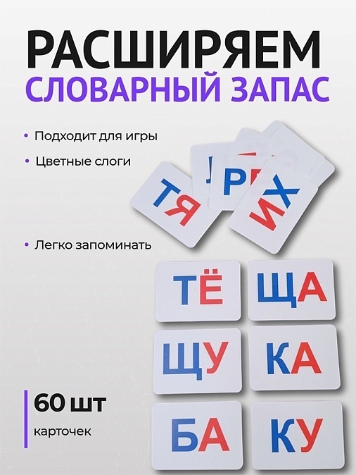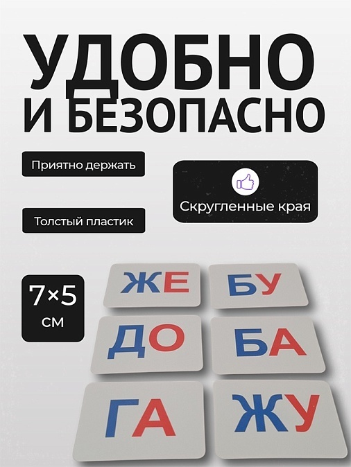 Каждая карточка изготовлена из прочного толстого пластика белого цвета с яркими цветными слогами - синими и красными. Приятная на ощупь поверхность и мягко скругленные края делают процесс обучения комфортным и безопасным для детских ручек. В комплекте вы получаете 60 карточек удобного размера, которые легко помещаются в небольших детских ладошках. Внимание, не давайте набор в руки детям до 3 лет!