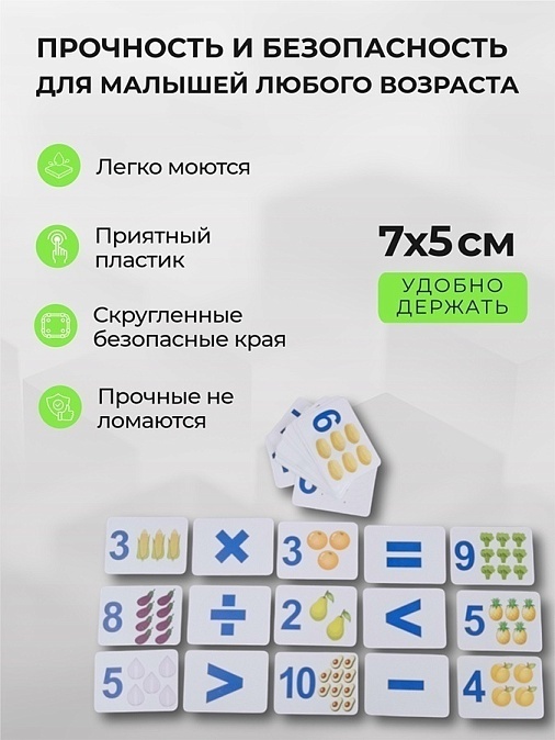 Карточки выполнены из прочного пластика, поэтому они не рвутся и не боятся влаги. Их можно хранить в коробке или брать с собой в дорогу, мыть – они сохранят яркость и форму.