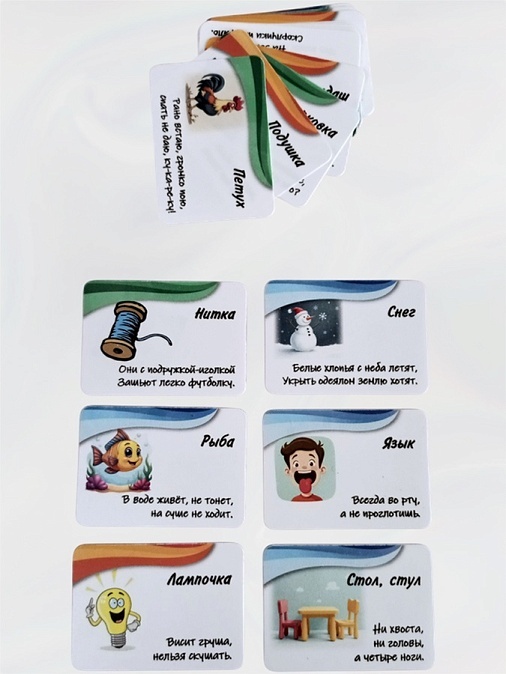 • Составление собственных загадок по аналогии с карточками – тренирует креативность.